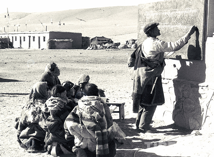 這是雙湖辦事處(現(xiàn)雙湖縣)嘎措鄉(xiāng)一村教師巴多在給孩子們上藏文課。巴多是村里唯一的教師,也是村里供銷社唯一的營(yíng)業(yè)員(唐召明1988年攝)