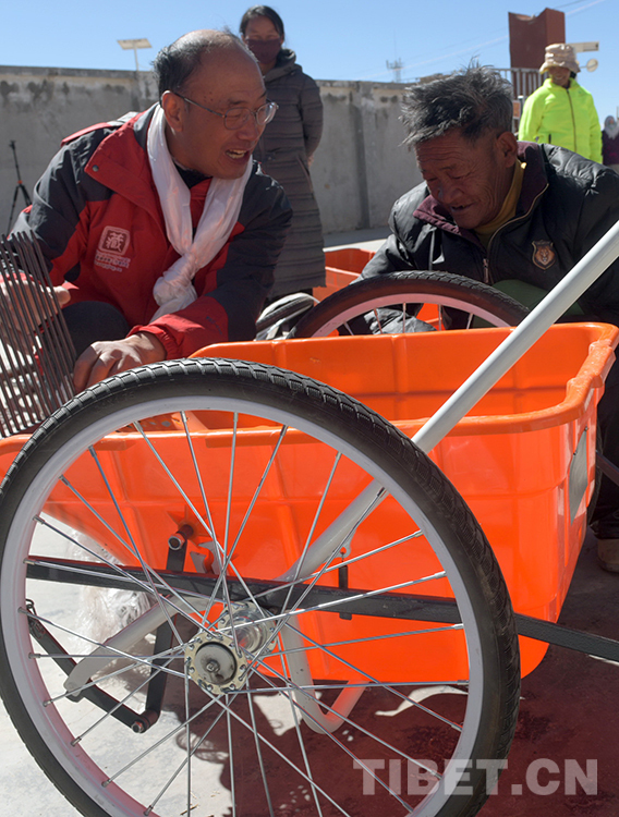 這是唐召明(左)在雙湖縣嘎措鄉(xiāng)一村指導(dǎo)他30多年前的房東、藏族牧民朋友日瑪(右)安裝北京建藏援藏工作者協(xié)會(huì)贈(zèng)送的高原撿拾車(楊月云2019年9月20日攝)