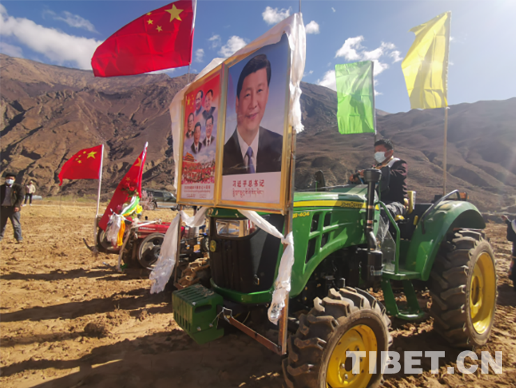 活動現(xiàn)場,群眾頭戴藏式金花帽,身著氆氌藏裝,或手持犁耙和鋤頭,或開著拖拉機,以吃切瑪、敬青稞酒、獻(xiàn)哈達(dá)、跳鍋莊、犁地、播種等傳統(tǒng)習(xí)俗,隆重慶祝共康村首屆開耕節(jié)。
