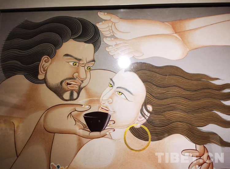 畫展特別展出了邊巴旺堆人物風情“四季”,以傳統(tǒng)的欽孜派唐卡藝術繪畫表達了春夏秋冬自然民俗風情,并以刻畫人物為個性特征,表達人一生經歷的生老病死。視覺的沖擊力讓繪畫作品更具藝術感染力,表現了高原人對大自然和生命的祟敬。“鎮(zhèn)魔圖”作品以西藏“鎮(zhèn)魔圖”傳說為繪畫基礎進行了探索性創(chuàng)作,通過四幅作品顯現西藏幾十年來這片高天厚土發(fā)生的翻天覆地的變化,也表達了藏傳佛教健康發(fā)展的愿望,繪畫作品在藝術手法上,色彩厚重絢麗,濃郁的傳統(tǒng)和現代繪畫完美融合,作品對末來充滿了想象,給每位觀眾帶來不同的藝術享受。作品“三毒”繪畫藝術創(chuàng)作,通過藝術繪畫作品直觀、具體、形象地批判社會發(fā)展中的不雅享樂追求。三組11幅邊巴旺堆階段性的代表作品,不同的傳統(tǒng)繪畫形式展示了欽孜派唐卡藝術之美。