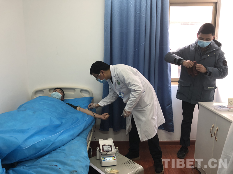 圖為洛隆縣武警支隊(duì)官兵為患者緊急獻(xiàn)血