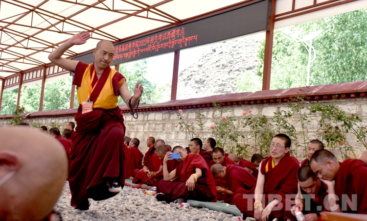 圖為6月21日下午,中國藏語系高級佛學(xué)院2022級“拓然巴”高級學(xué)銜班招生考試西藏考點(diǎn)現(xiàn)場,考僧正在互辯。攝影:王媛媛