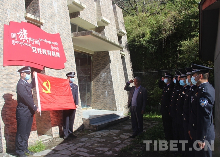 圖為民警在樟木鎮(zhèn)國旗阿媽黨性教育基地前重溫入黨誓詞