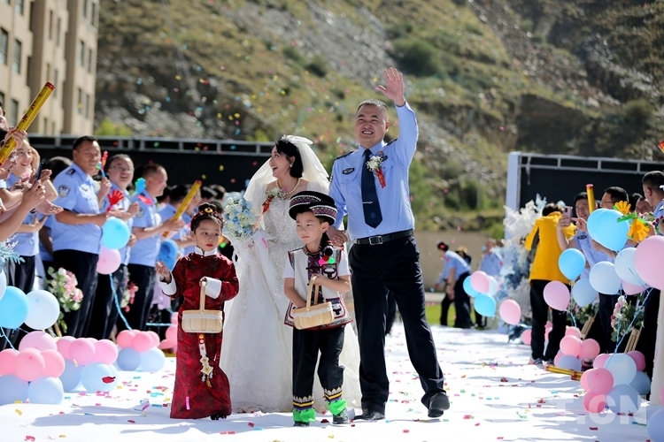 中國(guó)西藏網(wǎng)訊 8月5日,一場(chǎng)以“邊守·邊愛”為主題的集體婚禮在西藏出入境邊防檢查總站舉辦,12對(duì)戍邊民警夫妻在親朋好友和戰(zhàn)友們的見證下步入婚姻殿堂。