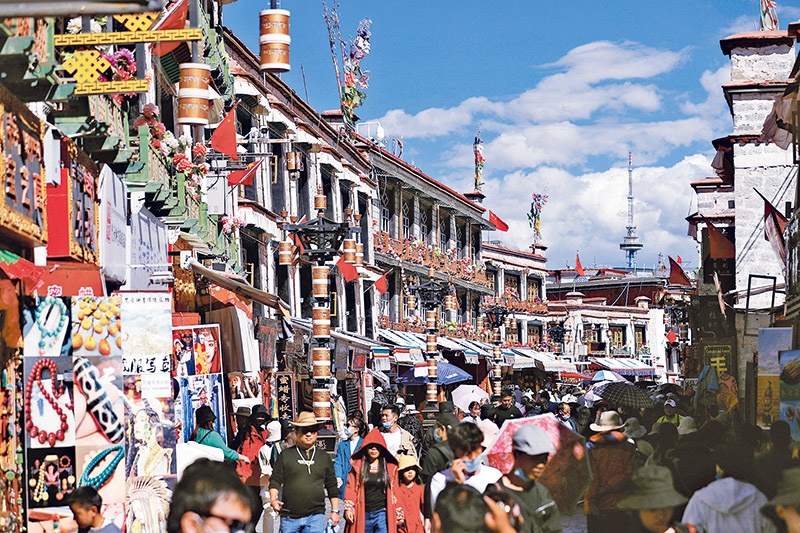 圖為眾多游客在八廓街觀光游覽 攝影:中新社記者富田