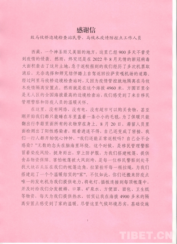中國西藏網訊 “感謝逆流而上的你們!盡管有些人未曾謀面,我也看不到你們疲憊的面容,但在我心中,馬攸橋邊境檢查站移民管理警察,就是我在西藏的親人們,是我們眼中的大英雄們!”這段感人肺腑的言語來自西藏出入境邊防檢查總站阿里邊境管理支隊馬攸橋邊境檢查站臨時安置點馬攸木2名博士的一封感謝信。