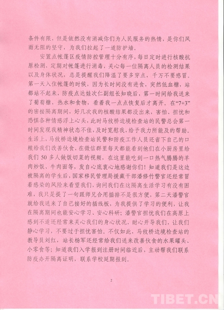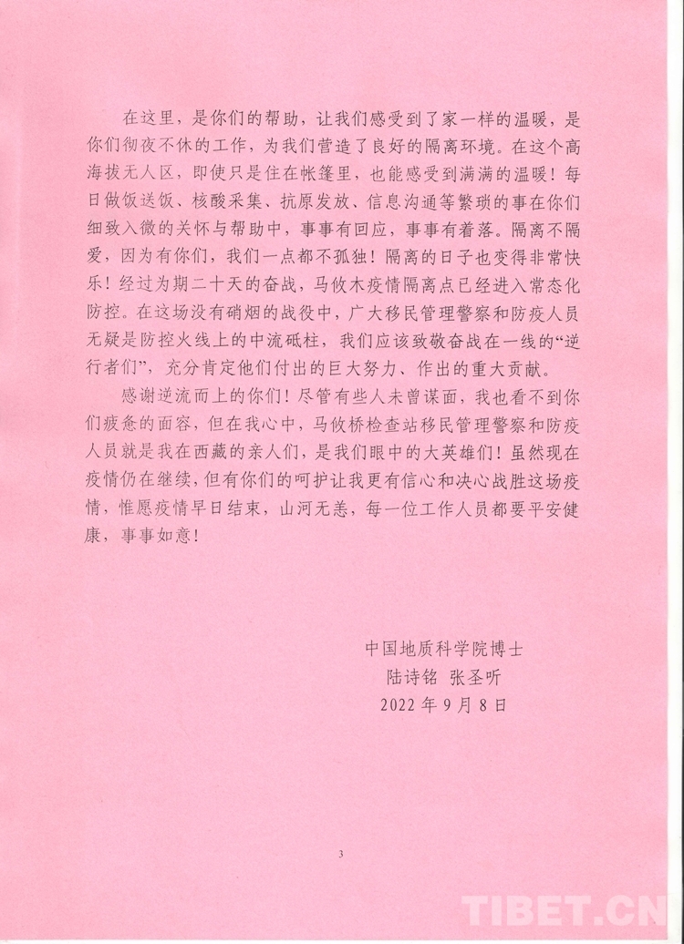 一次次走訪,一件件回應……這一系列真實、暖心的舉動,讓馬攸橋邊境檢查站的民警與滯留群眾建立了深厚情誼,也讓2人滯留結束回到北京后,寫下了這封感謝信。陸詩鳴、張圣聽的真情流露,飽含著群眾對馬攸橋邊境檢查站民警的信任,讓這個海拔4900多米的臨時安置點顯得更加溫暖。(中國西藏網 通訊員/張拴根 唐彪 記者/次旦拉姆 馬攸橋邊境檢查站供圖)