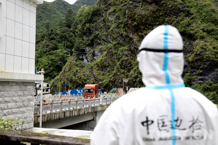 圖為民警正在使用無(wú)人機(jī)對(duì)貨運(yùn)通關(guān)現(xiàn)場(chǎng)進(jìn)行實(shí)時(shí)監(jiān)測(cè) 攝影:尼瑪?shù)┰?/p>