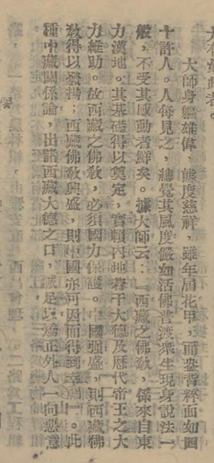 次年,應(yīng)重慶漢藏教理院和成都佛學(xué)社的邀請(qǐng),東本格西決定前往當(dāng)?shù)刂v法。期間,日本空襲不斷,拉薩官民與弟子因憂慮東本格西安危,力勸其勿前往。但是,東本格西從佛教利益世間的角度出發(fā),認(rèn)為在當(dāng)?shù)孛癖娍嚯y之際,作為僧人更應(yīng)不懼危險(xiǎn),前往當(dāng)?shù)匚拷迕癖?,以紓解?zhàn)爭(zhēng)造成的創(chuàng)傷與苦痛。1943年1月,東本格西從拉薩啟程前往理化(今理塘),參加九世班禪靈童尋訪測(cè)驗(yàn)事宜。4月,經(jīng)由康定抵達(dá)成都,沿途受到各地政府官員與僧俗弟子的歡迎。東本格西應(yīng)中國(guó)邊疆問題研究會(huì)邀請(qǐng)講演“佛教與邊疆”,蒙藏委員會(huì)委員格桑澤仁翻譯。[3]講演內(nèi)容主要分為三部分:首先,詳細(xì)敘述藏傳佛教發(fā)展演變的歷史,提出因于歷代高僧與中央政府的大力維護(hù)與資助,藏傳佛教發(fā)展的基礎(chǔ)才得以奠定;其次,分析邊疆佛教的分布與信仰狀況;最后,分析佛教與邊疆的關(guān)系。[4]他在講到佛教昌盛與國(guó)家實(shí)力發(fā)展之間的關(guān)系時(shí),明確提出“西藏之佛教,必須國(guó)力保護(hù),中國(guó)強(qiáng)盛,則藏傳佛教得以發(fā)揚(yáng),藏傳佛教興盛,則中國(guó)亦可因而得到幸福”[5]。東本格西從歷史和現(xiàn)實(shí)角度詮釋西藏作為中華民族共同家園的角色,邊疆不惟具體的地理概念和信仰文化差異的標(biāo)簽,而是中央政府長(zhǎng)期支持發(fā)展的歷史凝結(jié),是中華民族共同家園的一分子。