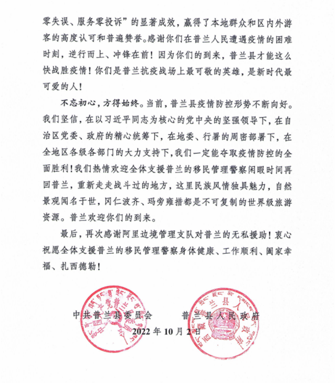 中國西藏網(wǎng)訊 “普蘭縣發(fā)生新冠肺炎疫情后,阿里邊境管理支隊(duì)第一時(shí)間選派精干力量支援普蘭疫情防控工作,為打贏疫情防控阻擊戰(zhàn)、攻堅(jiān)戰(zhàn)發(fā)揮了至關(guān)重要的作用?!?0月2日,西藏自治區(qū)阿里邊境管理支隊(duì)收到一封來自阿里地區(qū)普蘭縣委的感謝信。信中對(duì)阿里邊境管理支隊(duì)?wèi)?zhàn)“疫”一線民警在一個(gè)多月的疫情防控工作中,克服困難、勇于擔(dān)當(dāng)、不分晝夜、持續(xù)奮戰(zhàn)的抗疫工作表達(dá)了感謝,給予了肯定。