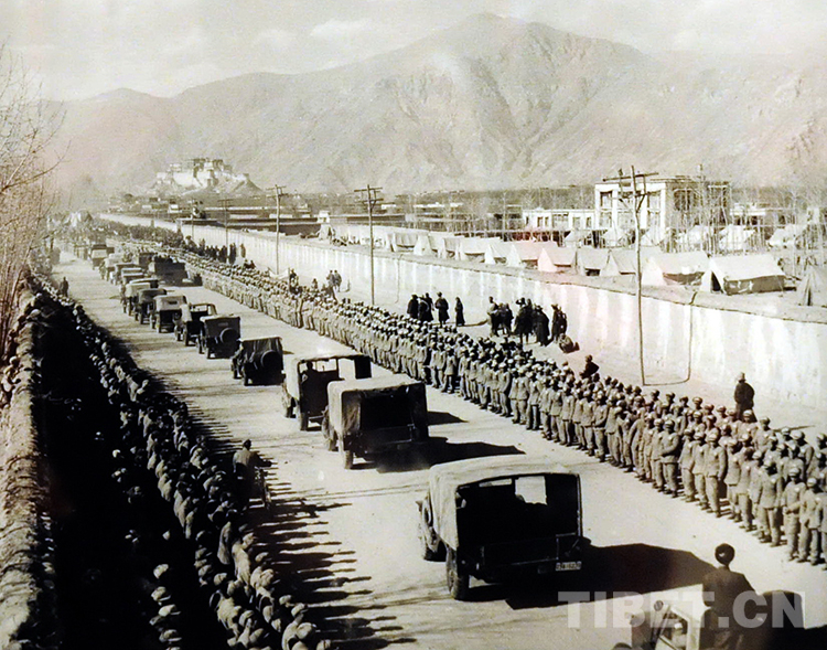 1954年12月25日,汽車(chē)第一次開(kāi)進(jìn)拉薩。當(dāng)天,青藏、川藏公路正式通車(chē),兩隊(duì)350多輛汽車(chē)披紅掛彩會(huì)師布達(dá)拉宮廣場(chǎng)(唐召明翻拍照片)