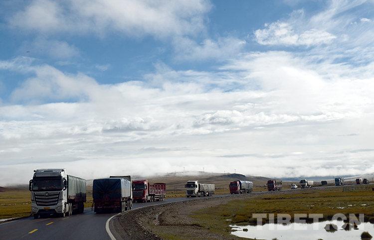 這是行駛在青藏公路安多縣路段的一輛輛重載卡車(chē)(唐召明2015年8月12日攝)
