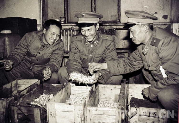 這是青藏公路五道梁兵站官兵在觀看自己新生產(chǎn)出的豆芽。在風(fēng)雪青藏公路線(xiàn)上,它豐富了過(guò)往人員就餐的“菜盤(pán)子”(唐召明1987年攝)