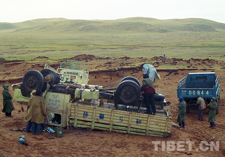 這是作者從西藏調(diào)到北京工作,所乘坐的“東風(fēng)”牌卡車(chē)不幸在唐古拉山下翻車(chē),得到了青藏公路安多養(yǎng)護(hù)段巴恰等道班工人的鼎力相助(唐召明1991年攝)