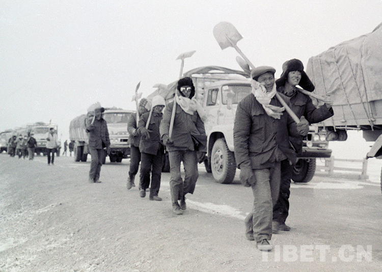 1954年5月11日,昔日鮮有人跡的唐蕃古道一下子變得熱鬧起來(lái)。在冰天雪地之中,一座座營(yíng)帳扎起來(lái)。在海拔5200多米的唐古拉山頂30多公里路段,6個(gè)施工隊(duì)分段作戰(zhàn),到處響徹雄壯的勞動(dòng)號(hào)子。人們用鎬頭刨,鋼釬撬,鐵錘打,一點(diǎn)點(diǎn)地?fù)傅羟斑M(jìn)路上的堅(jiān)石硬土。