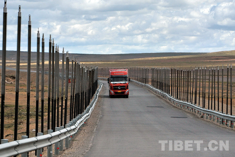 這是一輛卡車(chē)正在通過(guò)青藏公路兩邊立有一根根熱棒的凍土路段。熱棒是一種高效熱導(dǎo)裝置,可保持凍土終年不化(唐召明2015年8月12日攝)