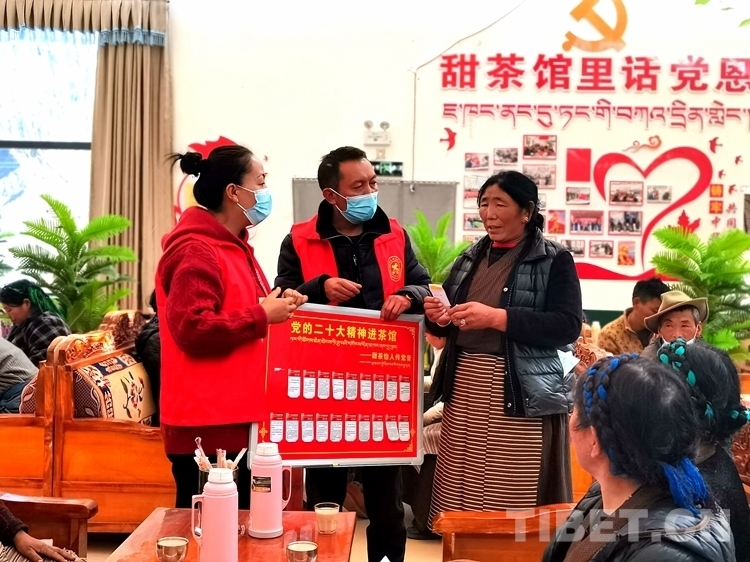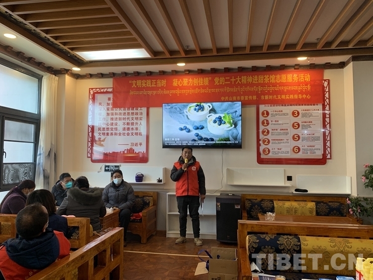 圖為山南市委宣傳部、山南市文明辦在文明實(shí)踐示范點(diǎn)開展黨的二十大精神進(jìn)甜茶館志愿服務(wù)活動(dòng)