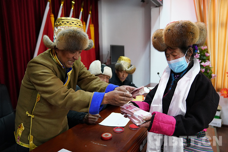 “普布達桑44565元、多吉扎西38750元、加央卓瑪2000元……”被叫到名字的村民和放牧員們紛紛上前領取入股后的第一次分紅。當天牧場為12名放牧員和入股的102戶村民共發(fā)放了64.65萬元的薪資和分紅款。