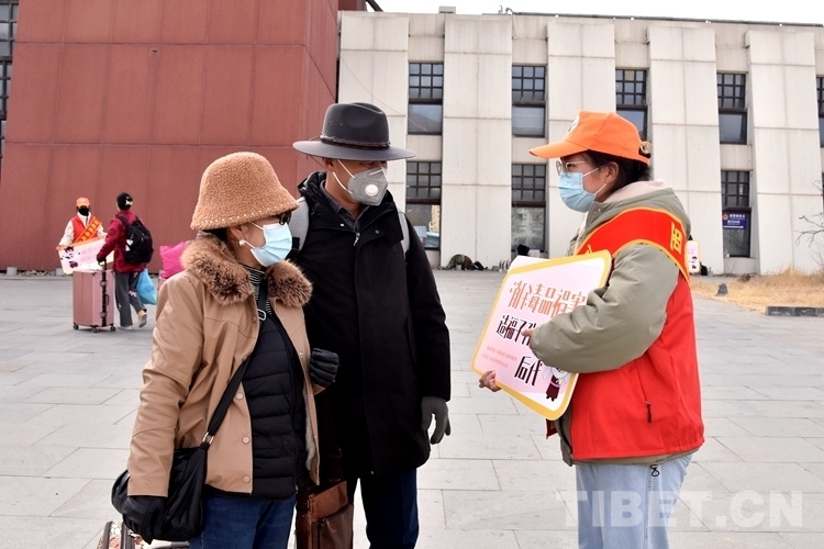 圖為活動現(xiàn)場志愿者向旅客宣講禁毒知識 攝影:次旦拉姆