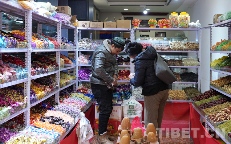 在八廓商城附近的一家門店里,來自新疆當(dāng)?shù)氐暮吞锎髼棥⑻焐缴硹?、葉城核桃、大白杏干、馬奶子葡萄干、天山烏梅、巴旦木等,因食材地道、品質(zhì)優(yōu)良格外受到拉薩市民的青睞。老板是位“00”后維吾爾族青年,頭腦靈活,待人熱情,近日來持續(xù)火爆的生意更是讓他高興得合不攏嘴。上門購(gòu)物的顧客有藏族、漢族、回族等民族,他們除了購(gòu)買地道的新疆干果,還會(huì)購(gòu)買該店專為藏歷新年新上的大白兔奶糖、彩色硬質(zhì)水果糖、果汁軟糖、巧克力、棒棒糖、藏式奶渣等貨品。人們用漢語加手勢(shì)比劃著交流,溝通無礙,再加上移動(dòng)支付方便快捷,老板誠(chéng)信經(jīng)營(yíng),顧客們總能高興而來,滿意而歸。