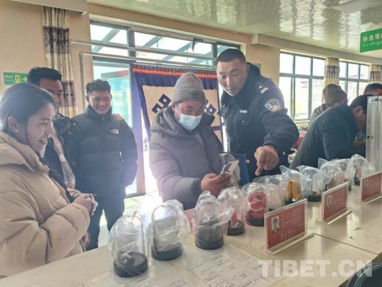 圖為那曲市色慶鄉(xiāng)禁毒辦民警向群眾講解毒品仿真樣品