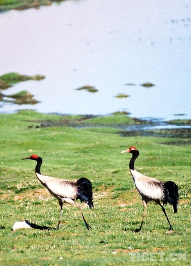 這是兩只漫步在藏北色林錯(cuò)國家級自然保護(hù)區(qū)的國家一級保護(hù)動(dòng)物、被稱為“鳥類熊貓”的黑頸鶴(唐召明2001年攝)