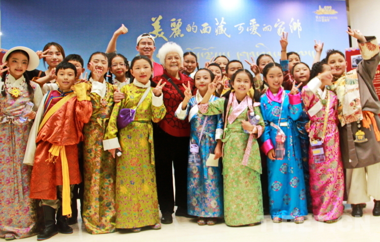 圖為《洗衣歌》編導(dǎo)、詞作者李俊?。ㄇ芭抛笪澹┡c西藏珠峰少年合唱團的小朋友們合影 攝影:劉莉