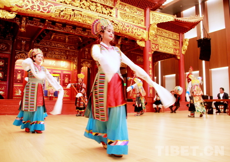 西藏藏劇團副團長米瑪普赤就藏戲的起源、藏戲的特點、藏戲的流派等進行了詳細介紹。伴隨著雄渾響亮的鼓鈸聲,西藏自治區(qū)拉薩市城關區(qū)娘熱民間藝術團的藝術家們表演了藏戲開場《溫巴頓》、藏戲唱腔《朗薩雯波》之貢桑德慶唱腔、拉薩囊瑪《吉白尼瑪》、嘎爾《郎卓》等經典片段。精美的服飾、鏗鏘的唱腔、緊湊的故事情節(jié)……贏得了與會嘉賓的連連贊嘆與陣陣掌聲。