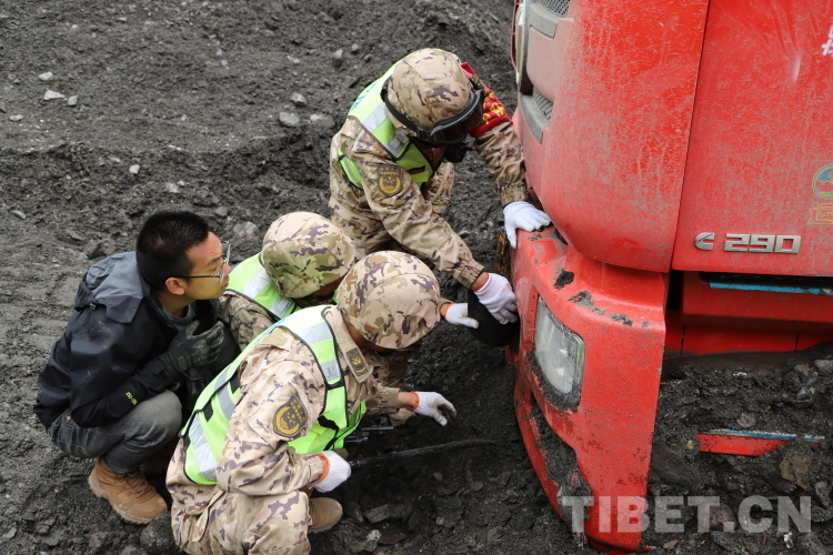 抵達(dá)現(xiàn)場后,武警官兵一邊安撫滯留群眾,給他們發(fā)放高原藥品;一邊對災(zāi)害現(xiàn)場進行勘察,并制定科學(xué)合理的搶通方案。在指揮員的指揮下,他們采取“雙向掘進、先通后拓”的戰(zhàn)法進行搶通。因部分車輛深陷泥石流被困,為解救出車輛,他們利用繩索拖拽的方法對被困車輛進行救援。