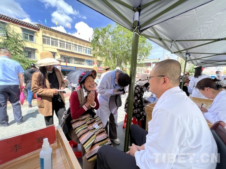 “從首都老遠(yuǎn)跑來給我們看病送藥,嘎真切(感謝)、故次仁(愿您長壽)?!毕虬颓谠诠强屏x診點給來自北京海淀區(qū)花園路社區(qū)衛(wèi)生服務(wù)中心主任李寒看完膝蓋、胳膊、肩膀等關(guān)節(jié)病后一會兒雙手合十、一會兒舉起大拇指、一會兒又跟李醫(yī)生握手表達(dá)著心中的感謝之情。