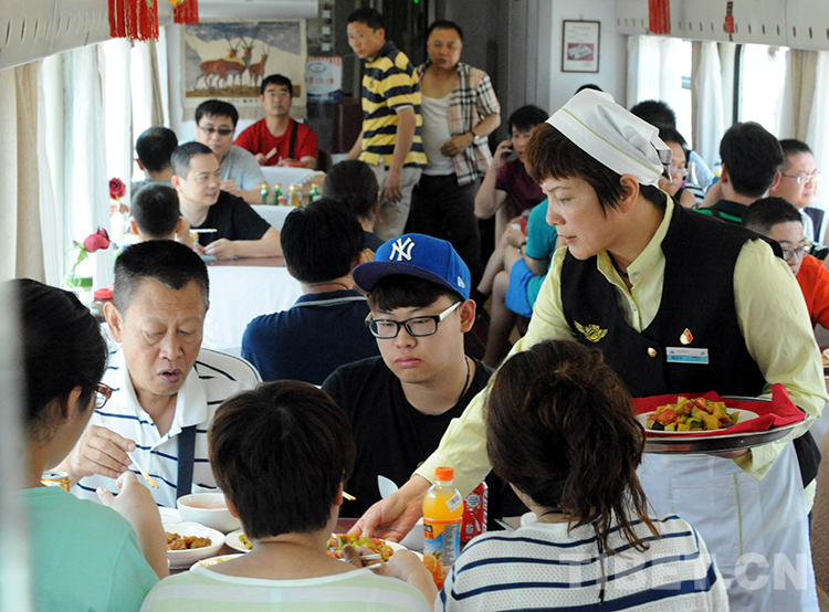北京鐵路局北京客運段京藏車隊副隊長彭海燕在北京開往拉薩的餐車上為就餐旅客服務(唐召明2014年7月5日攝)