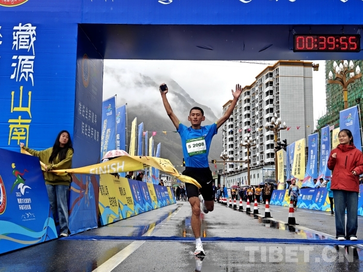 圖為競速跑11公里男子組第一名格桑旺堆抵達(dá)終點 攝影:次旦拉姆