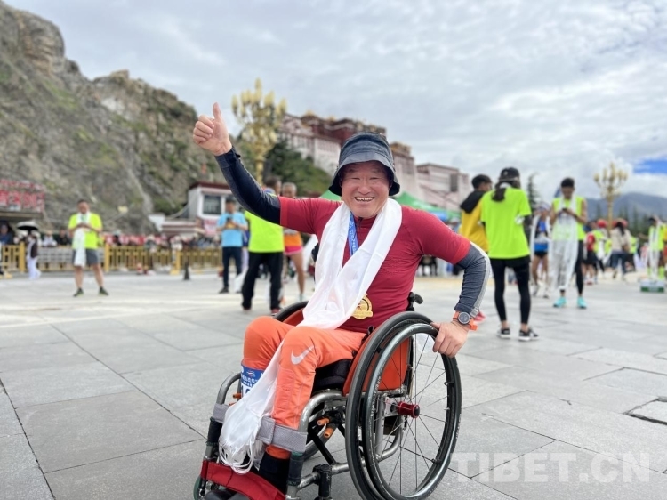 “馬拉松是一項(xiàng)極限運(yùn)動(dòng),這里是海拔最高的馬拉松比賽,我是本屆比賽殘疾人運(yùn)動(dòng)員中歲數(shù)最大的。沿途的風(fēng)景很美,后勤保障也做的很到位,希望有更多的殘疾人像我一樣走出來(lái)?!眮?lái)自河南洛陽(yáng)的殘疾人運(yùn)動(dòng)員商長(zhǎng)斌今年61歲,完賽后他臉上洋溢著難以掩飾的笑容接來(lái)工作人員向他敬獻(xiàn)哈達(dá)和獎(jiǎng)牌。
