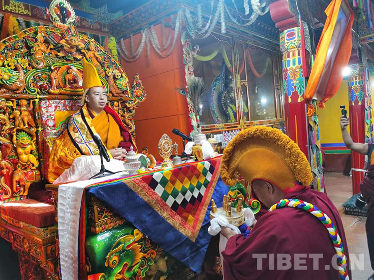 當日的拉定寺裝飾一新,班禪一行抵達后,現(xiàn)場法號齊鳴、法螺合奏,倫珠晉巴和僧眾在寺廟前舉行了隆重的歡迎儀式。隨后,在手持香爐、寶傘高僧的引導護送下,班禪步入主殿上寶座,向寺廟僧眾傳授《三主要道論》,為僧眾摸頂賜福、發(fā)放布施。