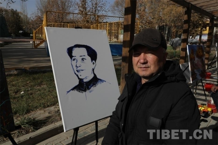 來到作畫區(qū)域,首先吸引記者注意的便是身穿黑衣、頭戴灰帽的西爾艾力·艾買提老人。在雪白的畫布前,老人用藍(lán)色和墨色顏料深淺描繪,勾勒出我們最熟悉的面孔。他向我們介紹說:“我畫的是我們偉大的毛主席年輕時(shí)候。沒有毛主席,我們中國(guó)人的生活不是這個(gè)樣子的,我很感恩他。我畫毛主席就是想讓更多人看見,讓他的故事得到更好的緬懷。”