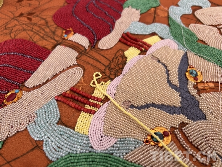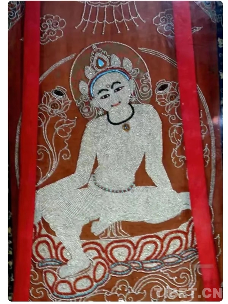 掌握了藏繡技藝,夫妻二人有了新的發(fā)展目標(biāo)。在傳承和發(fā)展傳統(tǒng)堆繡技藝的同時(shí),土旦想要?jiǎng)?chuàng)新更有特色的藏繡作品,于是創(chuàng)作“珍珠唐卡”的想法在他腦海中萌生?!爸韵胍?jiǎng)?chuàng)作珍珠唐卡,是因?yàn)橛写挝以谏侥系牟樗驴吹搅恕^世音菩薩憩息圖’這幅珍珠唐卡,我被它精美絕倫的制作工藝深深吸引,心想自己從事堆繡創(chuàng)作多年,也應(yīng)該去嘗試制作‘珠繡’作品了?!蓖恋┫蛴浾咧v述了他與珍珠唐卡的“結(jié)緣”經(jīng)歷。