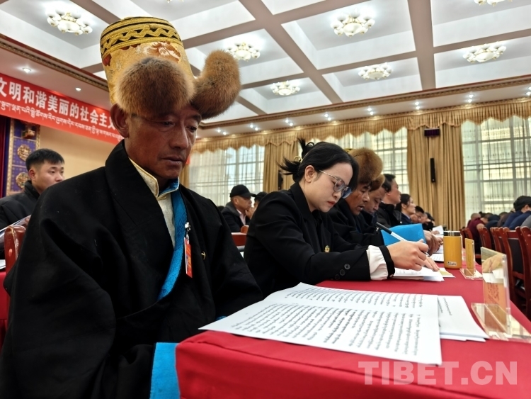 圖為政協(xié)委員認真審閱會議資料 攝影:次旦拉姆