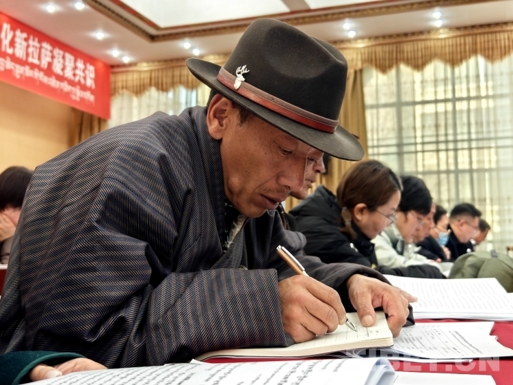 圖為政協(xié)委員在認真審閱藏文版會議資料 攝影:次旦拉姆
