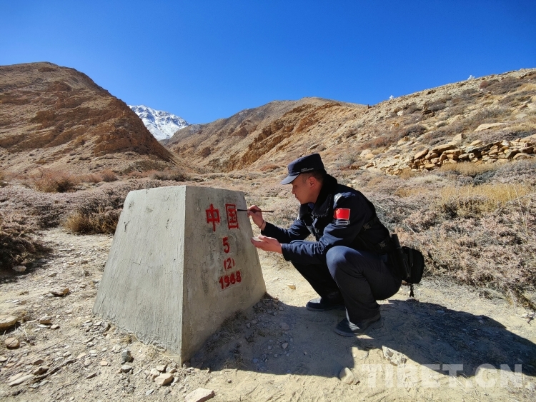 巡邏結(jié)束回到執(zhí)勤點(diǎn)后,邊巴次仁并沒(méi)有卸下執(zhí)勤裝備,而是拿著毛筆和紅油漆朝著執(zhí)勤點(diǎn)的河對(duì)岸走去,過(guò)河幾百米便是中尼5號(hào)界樁?!爸挥袌?jiān)守在邊境的我們才能體驗(yàn)到,除夕這天,為界碑描紅的自豪感?!彼贸雒P跟紅漆一筆一劃地描著界碑上的每一個(gè)字?!懊杓t界碑那一刻,眼前是界碑,身后是祖國(guó),我們守的是萬(wàn)家燈火?!边叞痛稳恃凵駡?jiān)定地看著身前的界碑說(shuō)。