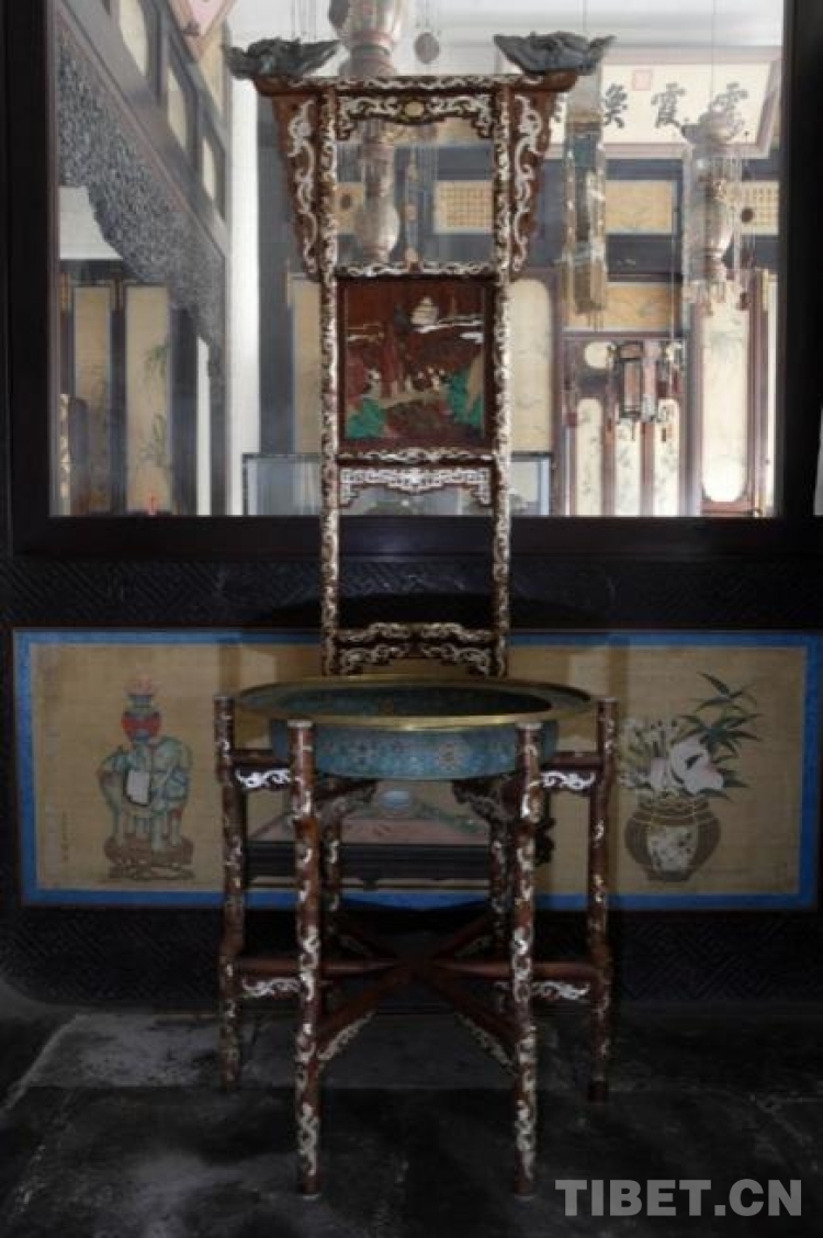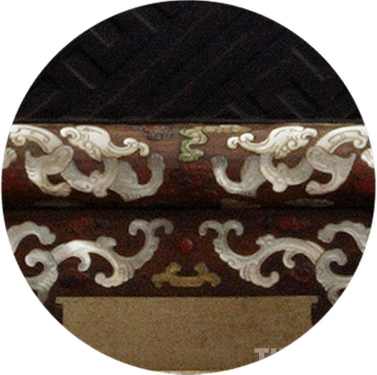 此款黃花梨木百寶嵌龍紋盆架,通體鑲嵌由螺鈿雕刻而成的草龍及拐子龍。前足高74.5厘米,通高201.5厘米,徑71厘米 。盆架六足,由兩層相交的棖子相連。選材優(yōu)良,質(zhì)堅(jiān)且木色、紋理俱佳。中牌子鑲嵌更見(jiàn)華麗,由牙、角、綠松石、壽山石、瑪瑙、金、銀等組成職貢圖,其中有高山陡崖、蒼松流水及各色人物,遠(yuǎn)處彩色祥云中呈現(xiàn)高大的殿堂,猶如人間仙境。(中國(guó)西藏網(wǎng) 綜合/周晶)