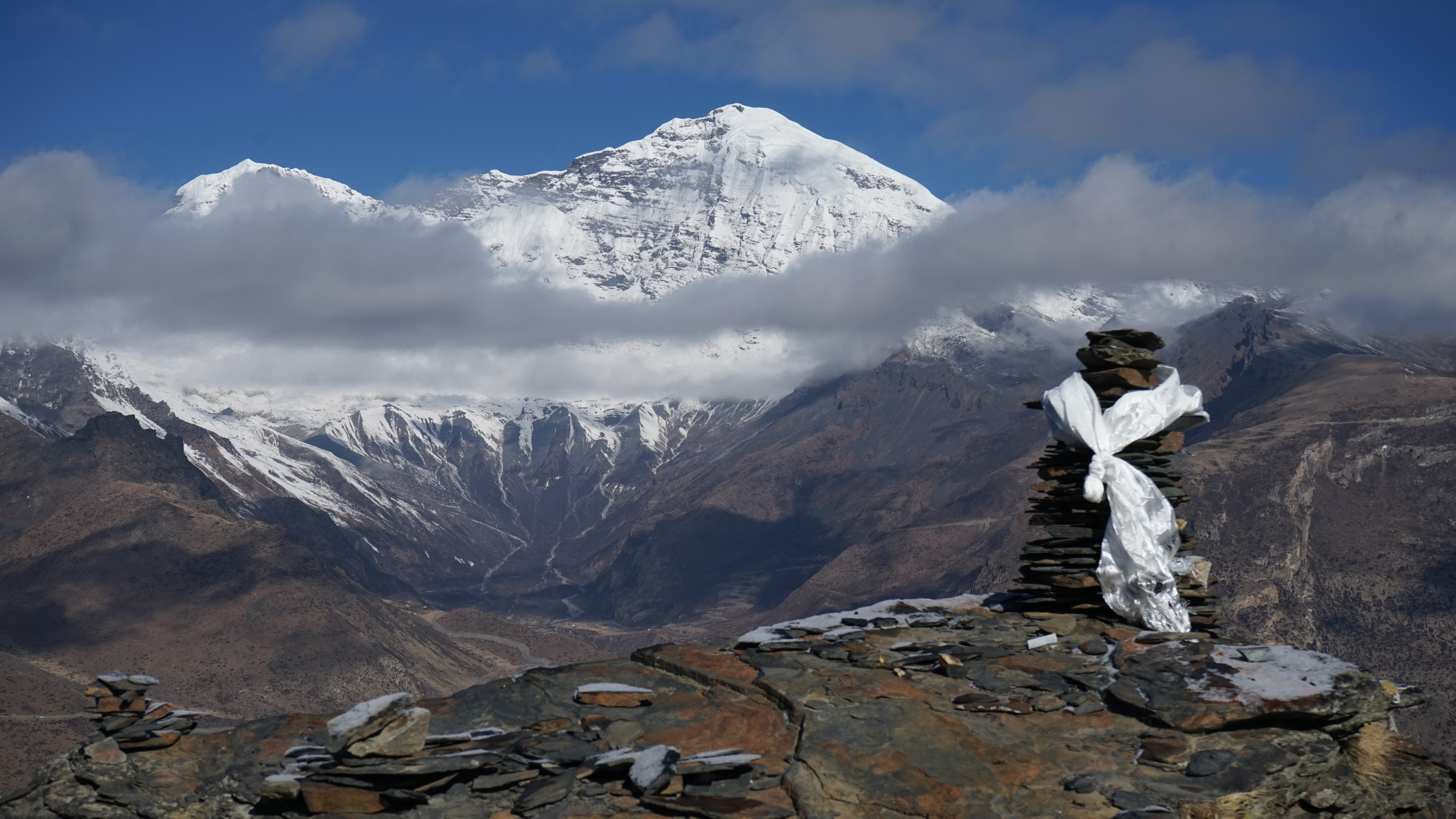 從拉康鎮(zhèn)到勒布溝要經(jīng)過海拔4431米的雄拉山口,此處是正面觀賞恰拉脫崗雪山的最佳地點。恰拉脫崗雪山又稱打拉日雪山,最高海拔6785米。雪山巍峨壯麗,若有若無的云霧為它平添了幾分神秘。因為是在藏歷新年期間,有很多當(dāng)?shù)厝藖磉@里祈福。