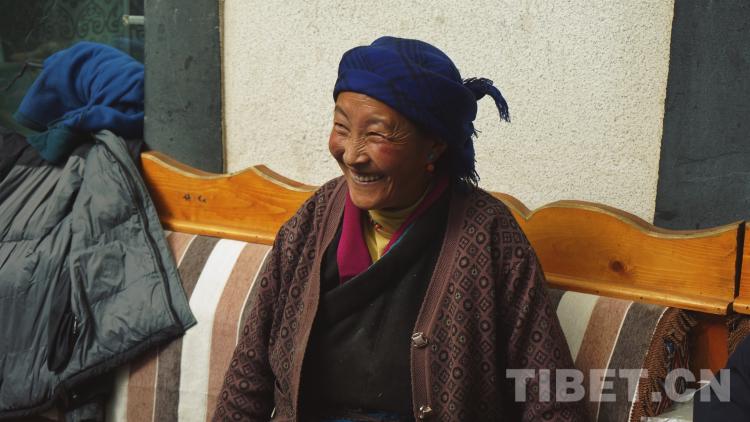 這是我最喜歡的莫啦。住在莫啦家的幾天里,除去采訪、收集素材和寫稿,最放松的時刻就是忙里偷閑和莫啦在廚房烤火、在巷子口曬太陽。莫啦會問我穿得這么少冷不冷,會給我講路過的小女孩有個雙胞胎姐姐,會讓我送熱水給我的同事喝,會拿盛滿卡塞和奶渣的點心盒塞給我吃,會在我想把手頭工作做完再吃飯時問同事我怎么不吃飯。當(dāng)然這些我大多是聽不懂的,有些是德瓊阿佳(莫啦的女兒,拉康社區(qū)婦女主任,同時也是客棧的老板)和達(dá)次哥(這次出差的司機師傅)翻譯給我的,有些是我倆通過比劃猜到的。
