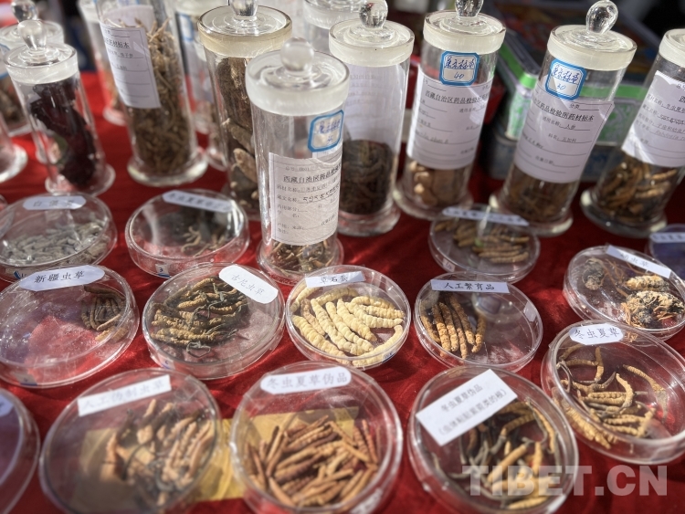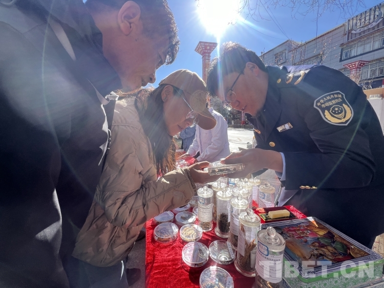 圖為市場(chǎng)監(jiān)管局工作人員向尼尼講解真假蟲(chóng)草辨別方法 攝影:德吉卓瑪