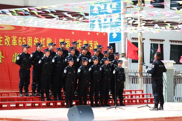 西藏吉隆出入境邊防檢查站移民管理警察與駐地各單位干部職工及廣大人民群眾以舉行升旗儀式、文藝匯演的方式紀(jì)念西藏民主改革65周年。