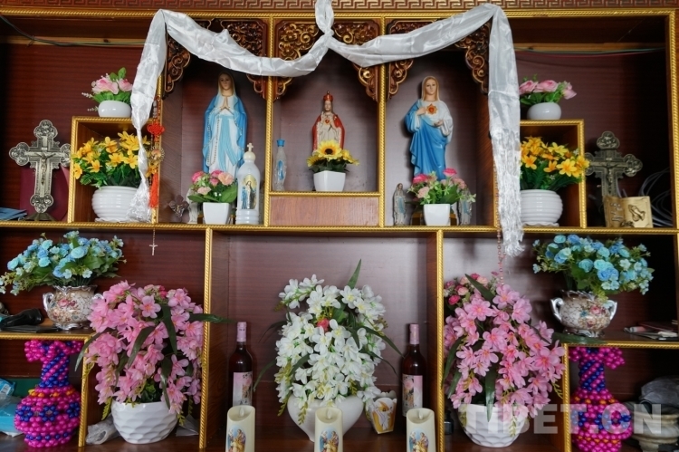 圖為阿多在耶穌、圣母瑪利亞像上懸掛哈達(dá)
