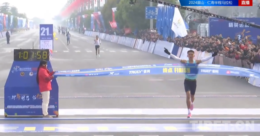 圖為2024仁壽半程馬拉來自西藏自治區(qū)運(yùn)動員扎西次仁奪冠并打破全國半馬記錄