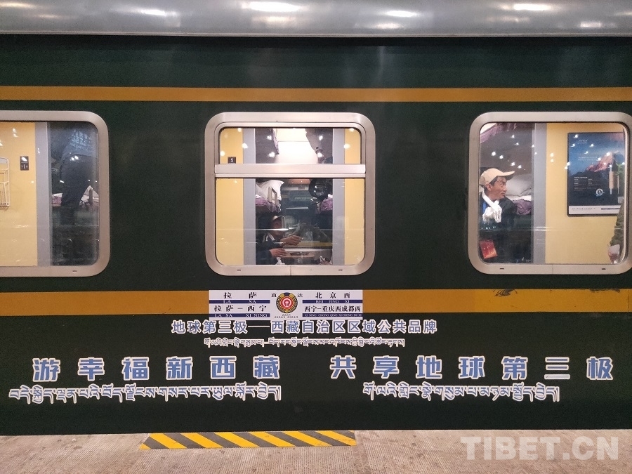 圖為考察學(xué)習(xí)團(tuán)成員乘坐的張貼“地球第三極”標(biāo)識(shí)的鐵路Z21次列車 攝影:周晴晴