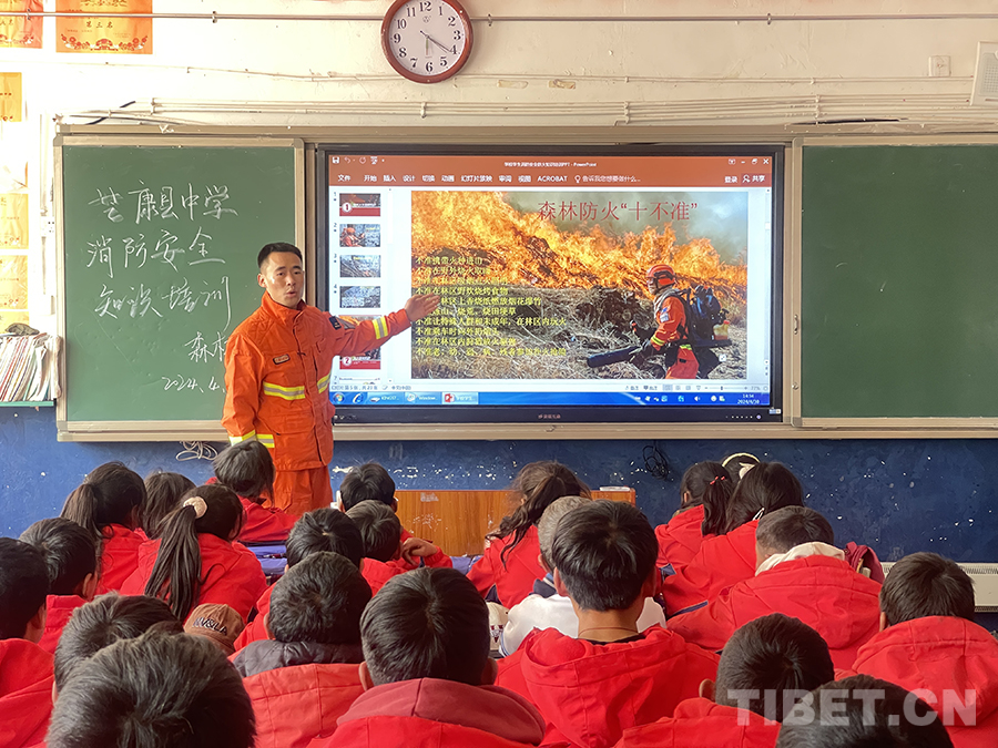 在芒康縣中學(xué)授課現(xiàn)場,芒康縣森林消防分隊負(fù)責(zé)人夏能向全校師生講解森林防火的重要意義、火災(zāi)的起因、相關(guān)法律法規(guī)和常用防火知識等,教育引導(dǎo)同學(xué)們樹立森林防火意識,做到不帶火種進(jìn)山,發(fā)現(xiàn)火情及時報警。