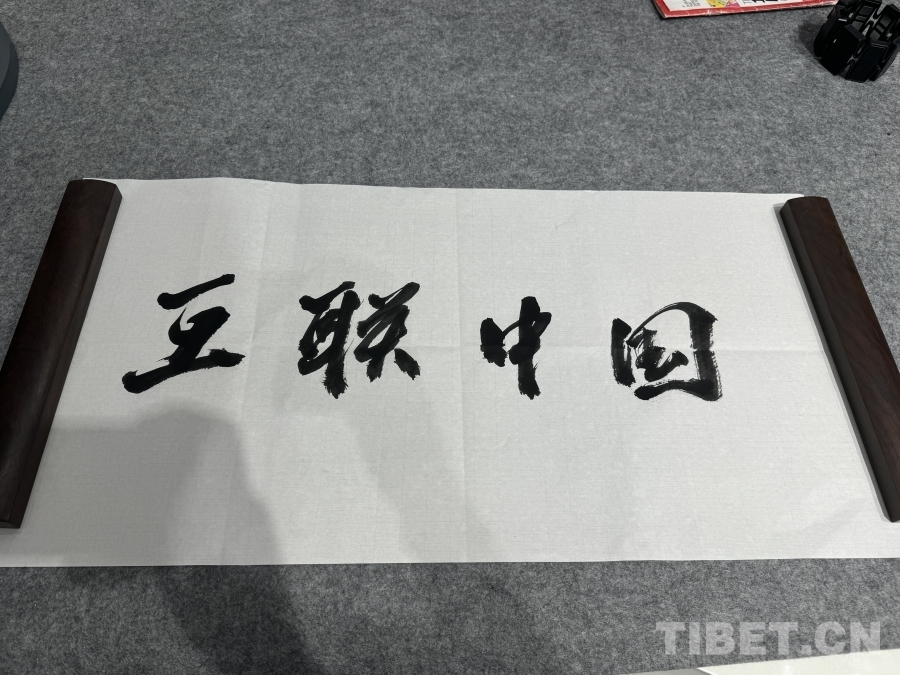 圖為BrainCo強(qiáng)腦科技產(chǎn)品體驗(yàn)官倪敏成用毛筆字寫的“互聯(lián)中國(guó)”四字