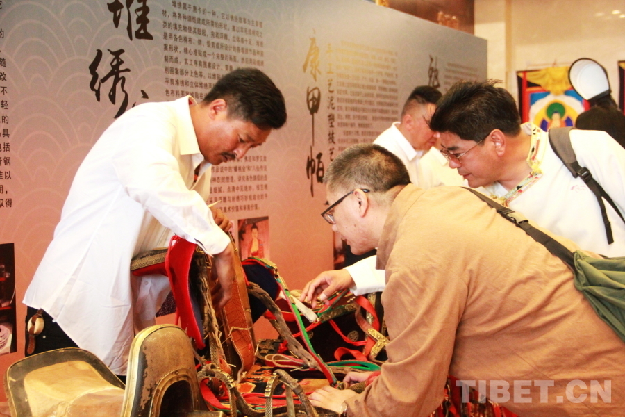 圖為“花開道孚 潤道有聲”道孚縣文化傳承發(fā)展座談會與會嘉賓在道孚縣非物質文化遺產展上了解馬具制作工藝 攝影:劉莉